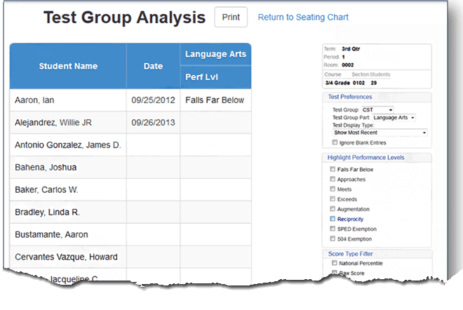 The Test Group Analysis displays the test results for all students in the section for a specific test such as a state-required test.