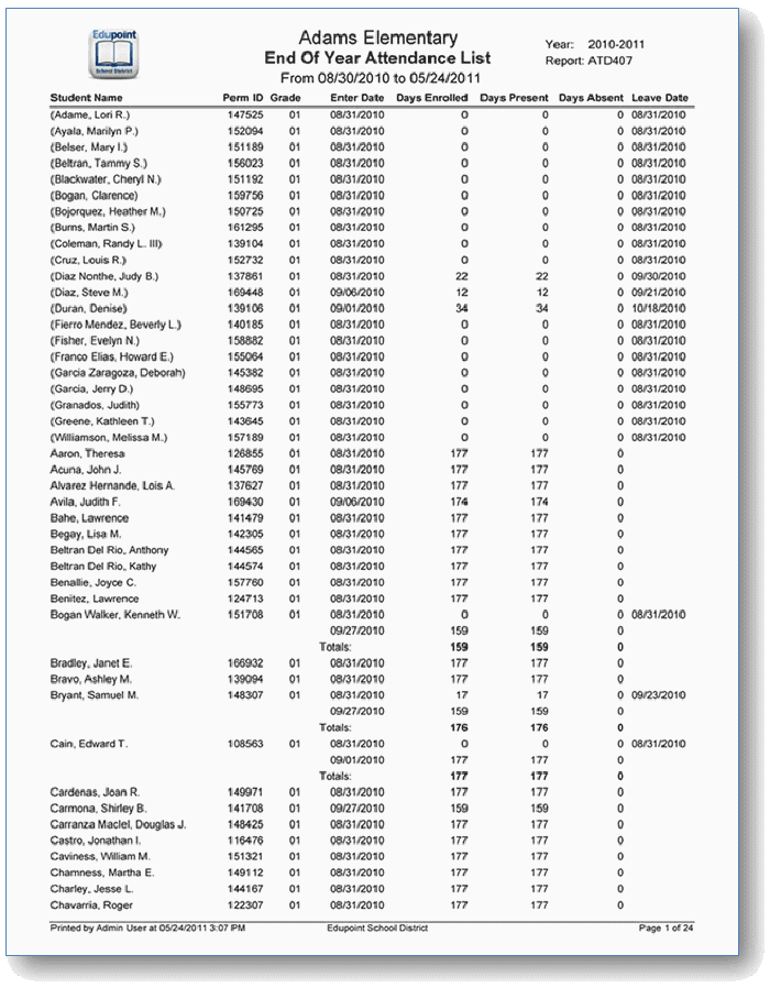 The ATD407 report lists students who are or have been enrolled within a school, showing enter and leave date, days enrolled, days absent and days present. This report is a tool for the school administrative staff to review student attendance for the selected date range.