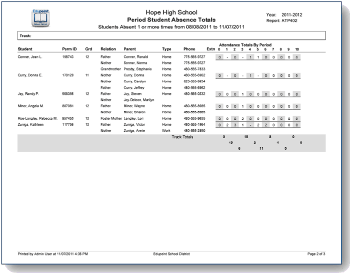 The ATP402 report prints a list of students that have a minimum period absence amount as indicated by the user within a selected date or date range. This report is utilized by attendance, administrative and teaching staff.