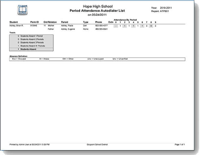 The ATP801 report is used in conjunction to an auto dialer system that is operated at the school site. The user can select specific absences that will generate the report. This is utilized by school staff to generate calls to parents through an auto dialer system to inform of student absences.