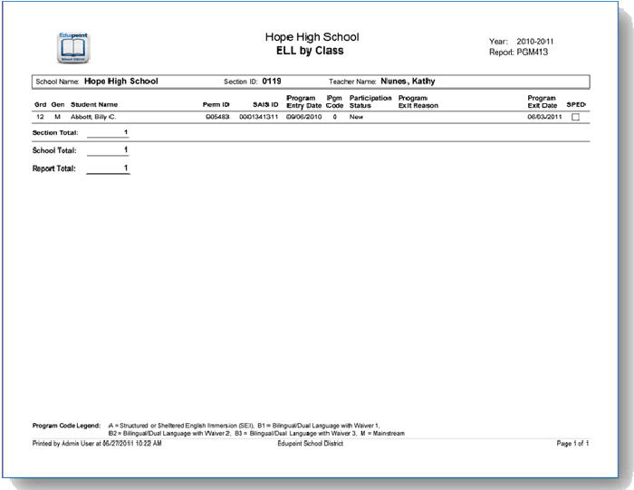 The PGM413 ELL by Class report prints an ELL list sorted by Section ID
