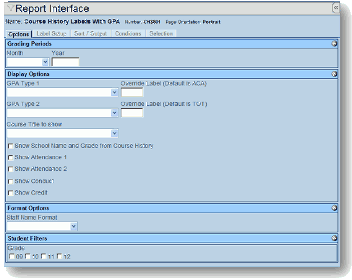 The CHS801 report prints course history labels with GPA. The user must select a month and year to print. The user may also select up to two GPA’s, attendance, conduct and credit to print. The user can filter the report for a specific grade or check all the grades to print. The labels include the student name, stu id, grade, course title, teacher, mark and academic GPA. If selected on the report options the labels will also print absences, total credits attempted and completed. High school staff and counselors use these labels for permanent record cards. These labels must be printed on a label size no less than 1 ½ x 2 13/16 (Avery 5360 Label).