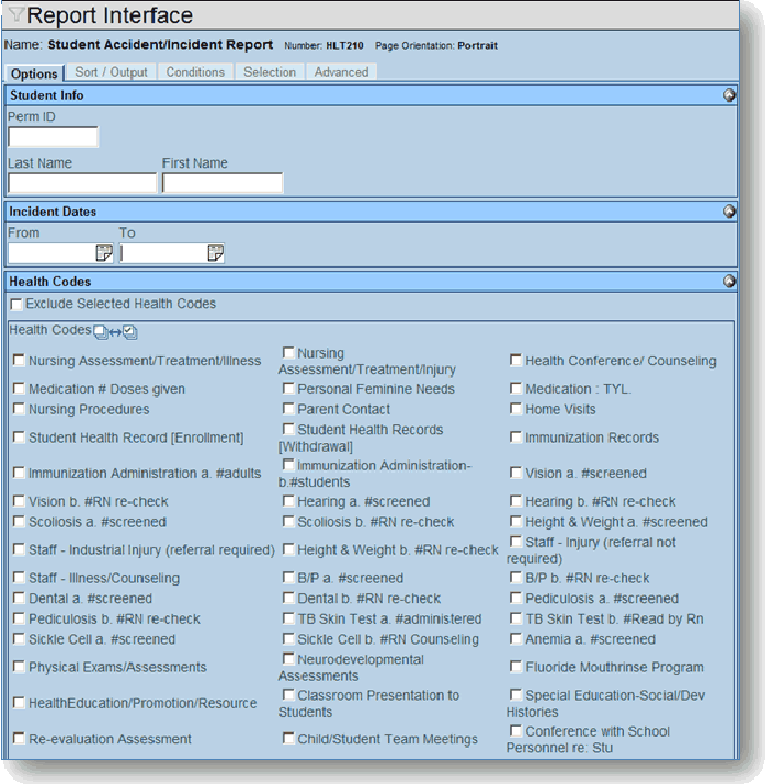 The HLT210 Student Accident/Incident Report prints an accident report by a selected student or students.