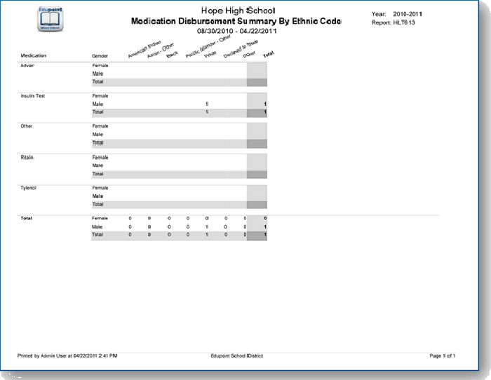 The HLT613 prints data pertaining to the disbursement of medications to students. The data is automatically filtered by Ethnic Code.