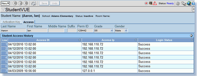 View an account access record of StudentVUE. See date and time of access, IP address of computer used, and whether login was a success or not.