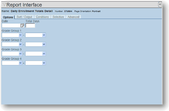 The STU604 report prints enrollment data on a per day basis. The report can be run at the District level to show enrollment detail by school, instructional setting and grade group. The maximum number of days that will print on the report is 10.