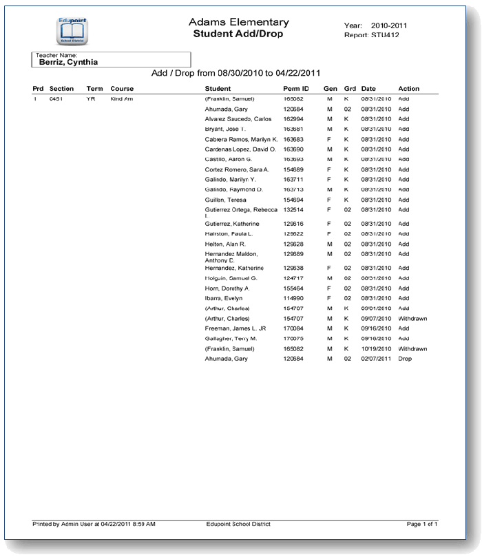 The STU412 report prints a list of students that have added or dropped from classes. The user can select specific absence reasons (by type or reason code) to be included on the report. ATP412 groups by teacher and section. This report is utilized by teachers to confirm student’s class adds and drops.