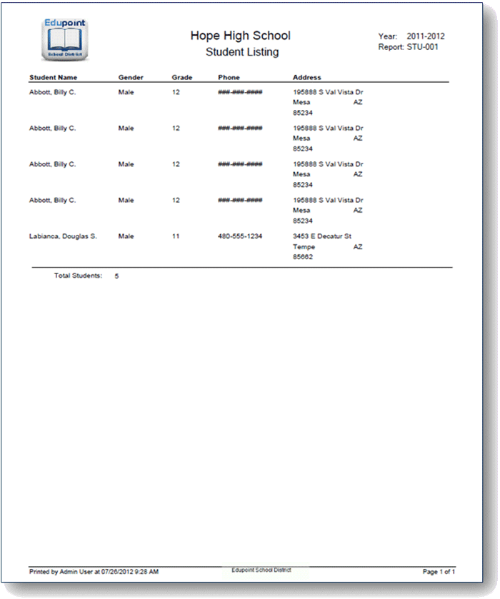 The Student Listing report prints a list of all students in Synergy SE. The report includes Student Name, Gender, Grade, Phone number and Address.