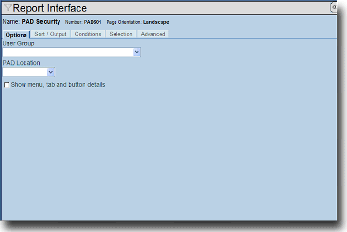 The PAD601 PAD Security report prints PAD Security detail by user group and view/report.